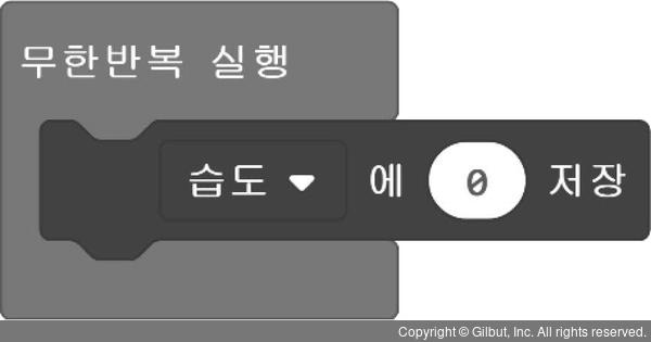 ➊ 이번에는 토양 습도 센서가 측정한 수분량을 ‘습도’ 변수에 저장하는 코드를 만들겠습니다. 변수 꾸러미에서 strip에 0 저장 블록을 가져와 무한반복 실행 블록에 연결하고, ‘strip’ 변수를 습도로 바꿉니다.