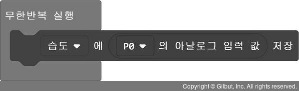 ➋ 고급 꾸러미를 눌러 핀 꾸러미를 선택하고, P0의 아날로그 입력 값 블록을 가져와 습도에 0 저장 블록의 ‘0’ 자리에 끼웁니다.