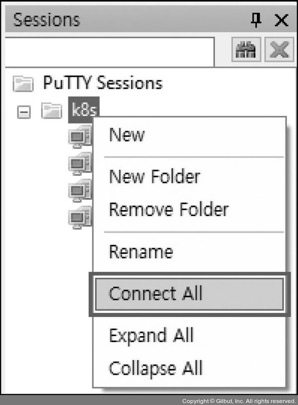 11. k8s 디렉터리에서 마우스 오른쪽 버튼을 누르고, Connect All을 선택해 모든 가상 머신에 한 번에 접속합니다.