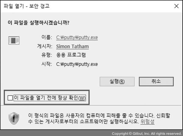 ▲ 그림 2-57 슈퍼푸티가 호출한 푸티 실행 파일에 대한 보안 경고 창