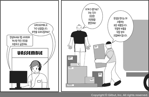 ▲ 그림 1-1 데이비드는 UAssemble 상점에서 옷장을 주문했지만 상점(프레임워크)은 데이비드(프로그래머)에게 새 옷장(앱)을 만드는 데 필요한 부품(소프트웨어 기능)만 배송한 것은 아니다, 상점은 그가 옷장을 만드는 데 필요할 것 같은 부품을 모두 배송했다, 제대로 된 결과(애플리케이션)를 얻고자 알맞은 부품(소프트웨어 기능)을 선택하고 조립하는 방법은 데이비드(프로그래머)가 정한다
