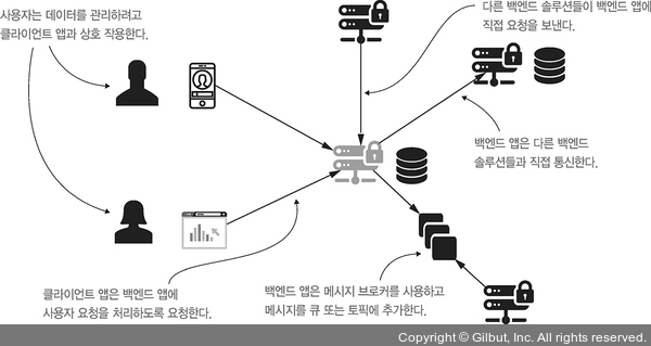 Note ≣ | 그림 1-5를 완벽히 이해하지 못했더라도 걱정하지 마라. 필자는 여러분이 메시지 브로커가 어떤 것이고 구성 요소 간에 데이터 교환 방법을 어떻게 설정하는지 이해한다고 가정하지 않는다. 필자가 바라는 점은 이런 시스템이 현실 세계에서는 복잡해질 수 있고 스프링 생태계의 프로젝트가 이런 복잡성을 최대한 제거하기 위해 만들어졌다는 것을 여러분이 이해하는 것이다.