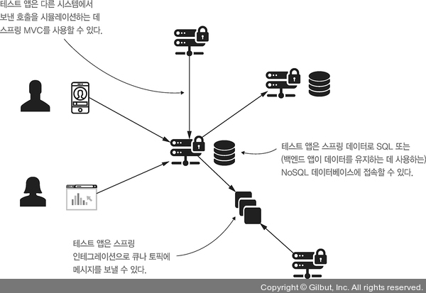 테스트 앱은 데이터베이스에 연결하거나 다른 시스템이나 테스트받는 시스템과 통신해야 할 수 있다, 개발자는 스프링 생태계의 구성 요소로 이런 기능 구현을 단순화한다