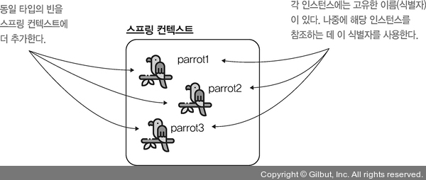 Note ≣ | 빈 이름과 앵무새 이름을 혼동하지 마라. 이 예제의 스프링 컨텍스트에서 빈 이름(또는 식별자)은 parrot1, parrot2, parrot3이며, 이를 정의하는 @Bean 메서드 이름과 같다. 필자가 앵무새에 부여한 이름은 Koko, Miki, Riki다. 앵무새 이름은 Parrot 객체의 속성에 불과하며 스프링에는 아무 의미가 없다.