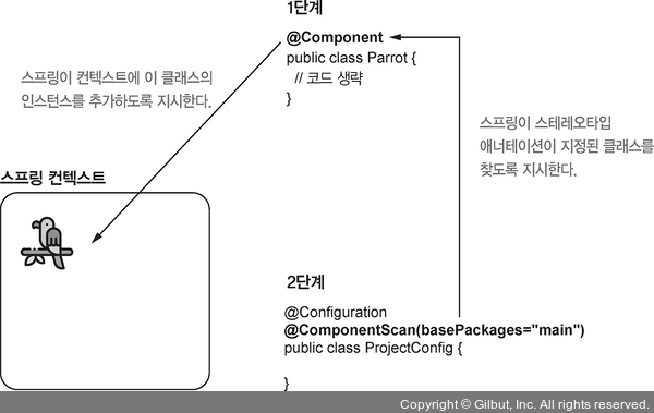 Parrot 클래스를 예로 들어 보자. Parrot 클래스에 스테레오타입 애너테이션 중 하나인 @Component 애너테이션을 지정하여 스프링 컨텍스트에 클래스 인스턴스를 추가할 수 있다.