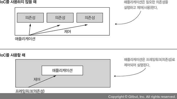 ▲ 그림 3-8 IoC 원칙을 사용하지 않는 애플리케이션은 자체적으로 실행을 제어하고 다양한 의존성을 사용한다, IoC 원칙을 사용하는 애플리케이션은 의존성이 앱 실행을 제어하도록 위임한다, DI가 바로 이런 제어에 대한 예다, 프레임워크(의존성)는 앱의 객체 필드에 값을 설정한다
