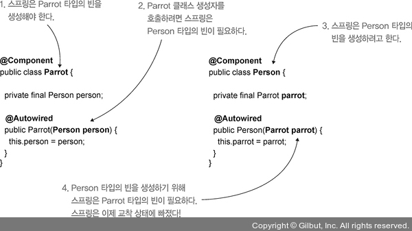 ▲ 그림 3-11 순환 의존성: 스프링은 Parrot 타입의 빈을 생성해야 하나 Parrot은 Person을 의존성으로 가져 스프링은 먼저 Person을 생성해야 한다, 그러나 Person을 생성하려면 스프링이 먼저 Parrot을 생성해야 한다, 스프링은 지금 교착 상태에 빠졌고 Person이 필요해서 Parrot을 만들 수 없으며 Parrot이 필요하기 때문에 Person을 만들 수 없다