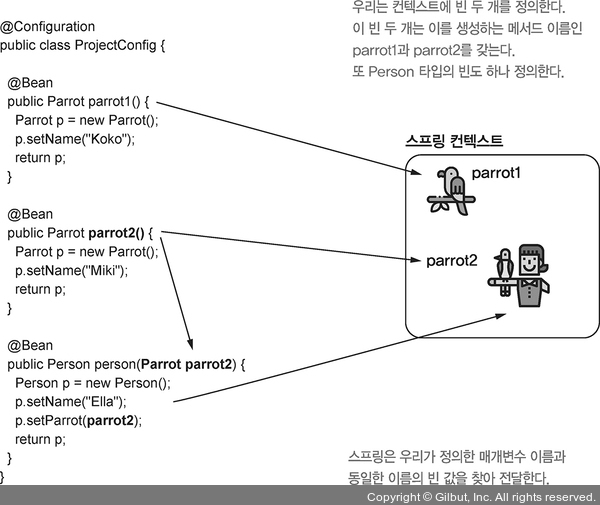 ▲ 그림 3-12 스프링 컨텍스트에 타입이 동일한 인스턴스가 두 개 이상 포함되어 있을 때 스프링이 컨텍스트에서 특정 인스턴스를 제공하도록 지시하는 한 가지 방법은 이 인스턴스 이름을 사용하는 것이다, 매개변수 이름을 스프링이 제공하고자 하는 인스턴스와 동일하게 지정하면 된다