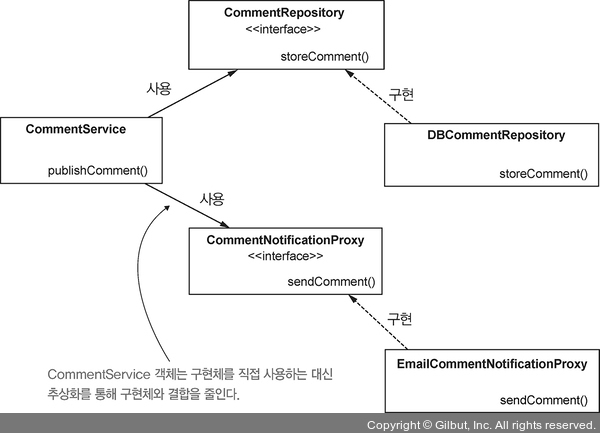 다음 그림은 추상화로 이 클래스 설계를 분리하는 방법을 보여 준다. CommentRepository와 CommentNotificationProxy를 클래스로 설계하는 대신 기능을 정의하기 위해 이 클래스들을 구현할 수 있는 인터페이스로 설계한다.