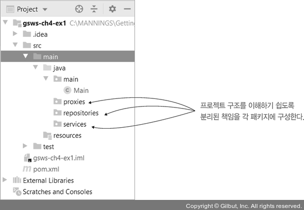 ▲ 그림 4-7 프로젝트 구조를 보여 준다, 프로젝트 구조를 쉽게 읽고 이해할 수 있도록 각 책임에 대해 별도 패키지를 선언한다