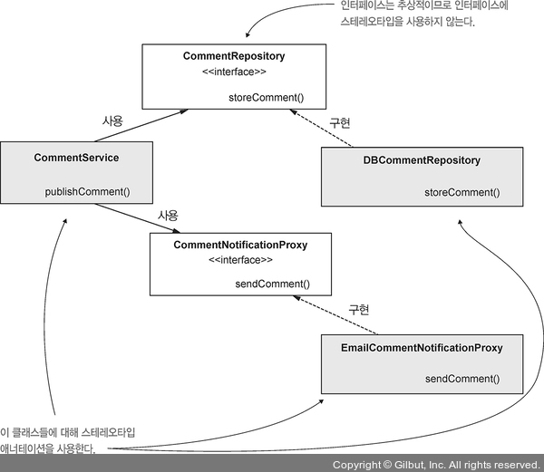 ▲ 그림 4-8 @Component 스테레오타입 애너테이션으로 표시할 클래스는 회색으로 표시된다, 컨텍스트가 로드되면 스프링은 이런 클래스의 인스턴스를 생성하고 해당 컨텍스트에 추가한다
