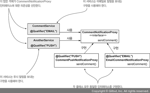 ▲ 그림 4-11 서로 다른 객체가 동일한 계약에 대해 서로 다른 구현을 사용해야 하는 경우 @Qualifier로 이름을 지정하면 스프링이 어디에서 어떤 의존성을 주입해야 하는지 알려 줄 수 있다