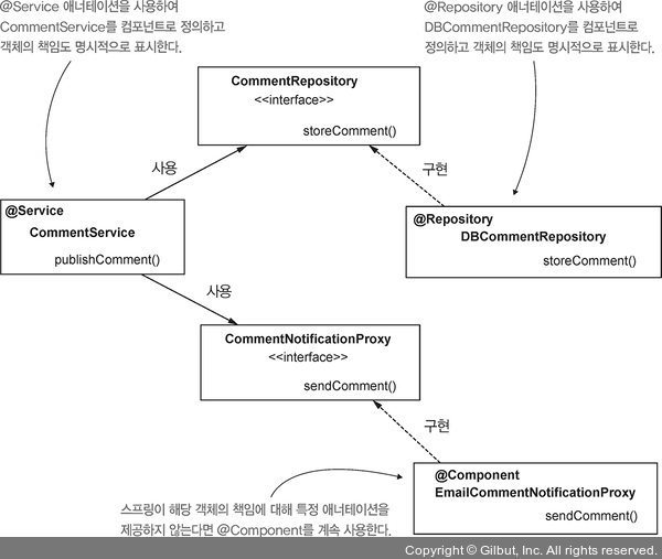 ▲ 그림 4-12 @Service와 @Repository 애너테이션으로 클래스를 설계할 때 컴포넌트 책임을 명시적으로 표시한다, 스프링이 그 책임에 대해 특정 책임을 제공하지 않는다면 @Component를 계속 사용한다