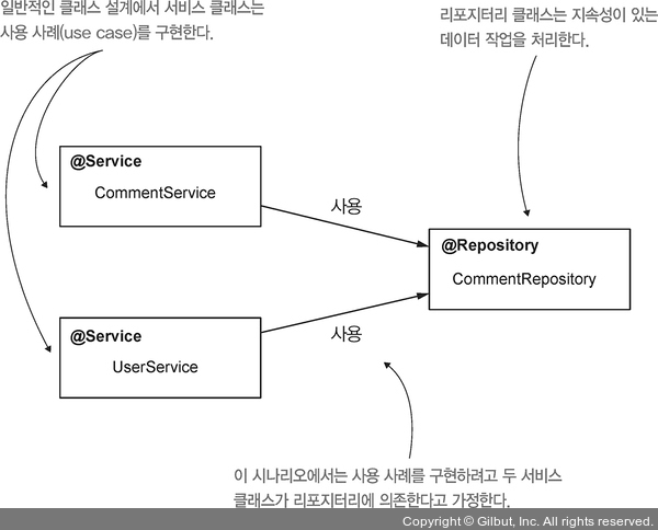 ▲ 그림 5-3 시나리오 클래스 설계를 보여 준다, 사용 사례를 구현하려고 두 서비스 클래스는 리포지터리에 의존한다, 싱글톤 빈으로 설계되었다면 스프링 컨텍스트는 각 클래스에 대해 하나의 인스턴스를 보유할 것이다