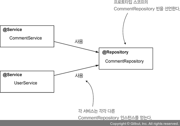 ▲ 그림 5-8 각 서비스 클래스가 CommentRepository 인스턴스를 요청한다, CommentRepository는 프로토타입 빈이므로 각 서비스는 각각 다른 CommentRepository 인스턴스를 얻는다