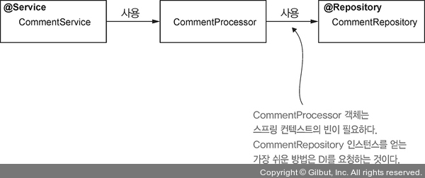 ▲ 그림 5-10 CommentProcessor 객체가 CommentRepository 인스턴스를 사용해야 할 때 가장 쉽게 인스턴스를 얻는 방법은 DI를 요청하는 것이다, 하지만 이렇게 하려면 스프링은 CommentProcessor에 대해 알아야 하므로 CommentProcessor 객체가 컨텍스트의 빈이어야 한다