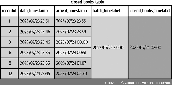 23시부터 자정까지에 대한 closed_books_table에는 그 시간 윈도우에 속하는 행이 모두 있습니다. 따라서 closed_books_table은 DTW 배치 테이블입니다. 분석가는 이 배치를 쿼리할 수 있으며 분석이 23시부터 자정 사이에 대해 완료되었다고 보장할 수 있습니다.