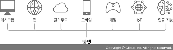 닷넷(.NET)은 소프트웨어 프레임워크로, 응용 프로그램의 개발 속도를 높이는 데 도움이 되는 API(Application Programming Interface) 및 서비스 모음입니다. 2002년 2월 13일 1.0 버전으로 세상에 공개했고, 동일하게 C#도 1.0 버전으로 출시했습니다. 닷넷 프레임워크(.NET Framework), 닷넷 코어(.NET Core), 닷넷 스탠다드(.NET Standard)처럼 닷넷으로 시작하는 용어들은 모두 닷넷 생태계에 포함됩니다. C#은 닷넷 생태계의 모든 영역에서 사용할 수 있는 프로그래밍 언어입니다. 필자가 C#을 가장 많이 쓰는 이유는 닷넷의 모든 영역에서 사용할 수 있고 LINQ 기능으로 쉽게 프로그래밍할 수 있기 때문입니다.