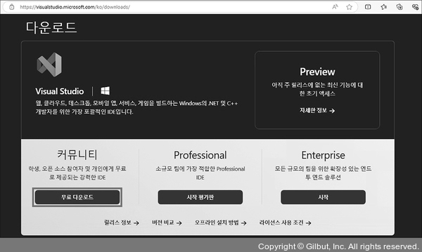 C# 학습용 개발 도구인 비주얼 스튜디오의 최신 버전을 내려받아 설치해 보겠습니다. 집필 시점에서 최신 버전은 비주얼 스튜디오 2022이며, 이후 버전이 출시되어도 진행 과정은 비슷할 것입니다.