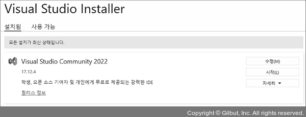 7. 설치가 완료되면 Visual Studio Installer에 다음 그림과 같이 비주얼 스튜디오 커뮤니티 2022 목록이 추가됩니다. 참고로 필자 환경에는 이전 버전인 비주얼 스튜디오 2019도 함께 설치되어 있습니다.