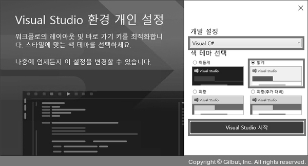 10. 이제 개발 설정 및 테마를 선택하는 화면이 나옵니다. 책에서는 개발 설정으로 ‘Visual C#’, 색 테마 선택으로 기본 선택 테마인 ‘밝게’를 지정했습니다. 여기에서 개발 설정을 다르게 선택하면 이후 메뉴 구성이 조금 다를 수 있습니다. Visual Studio 시작을 누릅니다.2