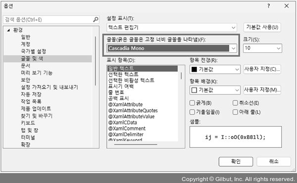 Note ≡ 비주얼 스튜디오 메뉴의 도구 > 옵션 > 환경 > 글꼴 및 색 > 글꼴에서 글꼴을 변경할 수 있습니다. 필자는 Cascadia Mono 글꼴을 선택했습니다. 취향에 따라 선택해 보세요.