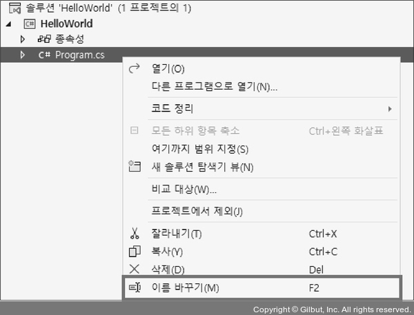 8. 비주얼 스튜디오의 솔루션 탐색기에서 Program.cs 파일을 마우스 오른쪽 버튼으로 누른 후 이름 바꾸기를 선택하고 HelloWorld.cs로 이름을 변경합니다. 파일 이름을 변경하지 않아도 되지만, 이 책 전체에서는 구별하기 쉽게 프로그램 의미를 지닌 CS 파일 이름으로 통일하겠습니다.