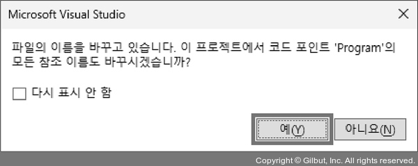 이때 변경하는 과정에서 관련 이름을 모두 바꾸겠냐는 경고창이 뜬다면 예를 누릅니다.