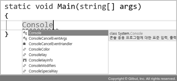 바로 앞 코드에서는 Console을 입력할 때 팝업창이 뜹니다. 이러한 팝업창을 인텔리센스(intelliSense) 기능이라고 합니다. 일반적으로 가장 많이 사용하는 명령어 가이드를 제공하므로 익숙해지면 좀 더 빠르고 정확하게 코드를 작성할 수 있습니다.