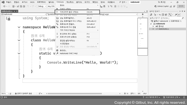 ▲ 그림 3-13 프로그램을 실행하는 [디버그하지 않고 시작] 메뉴 선택