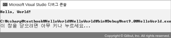 11. 프로그램이 실행되면 간단한 빌드(컴파일) 과정을 거친 후 다음 그림과 같이 콘솔창에 “Hello, World!”를 텍스트로 출력합니다. 콘솔창에 뜨는 다른 안내 메시지는 무시합니다.