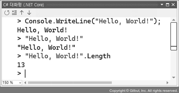 2. C# 인터렉티브에서 Console.WriteLine(“Hello, World!”);이라고 입력한 후 Enter 를 누르면 Main() 메서드를 만들지 않고도 바로 화면에 “Hello, World!” 문자열을 출력할 수 있습니다.