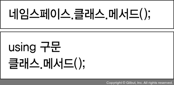 예를 들어 다음 두 코드는 동일합니다. 왼쪽 코드는 네임스페이스.클래스.메서드(); 형태고, 오른쪽 코드는 네임스페이스를 using으로 선언했기 때문에 클래스.메서드(); 형태입니다. 이 책에서는 오른쪽 코드처럼 using 문을 사용할 것입니다.