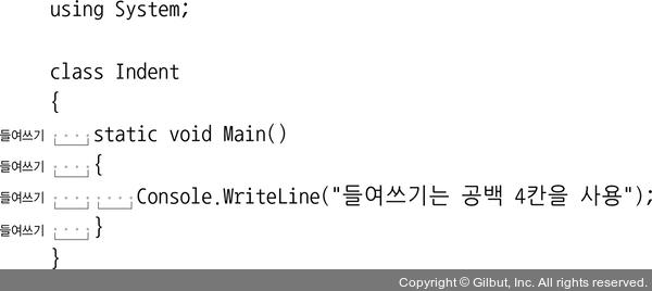프로그램 소스 코드는 가독성(readability)을 고려하여 들여쓰기(indent)를 해야 합니다. 일반적으로 시작 중괄호 다음 코드는 들여쓰기를 합니다.