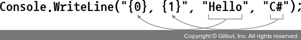 > Console.WriteLine("{0}, {1}", "Hello", "C#");