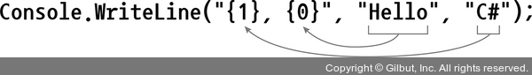 > Console.WriteLine("{1}, {0}", "Hello", "C#");