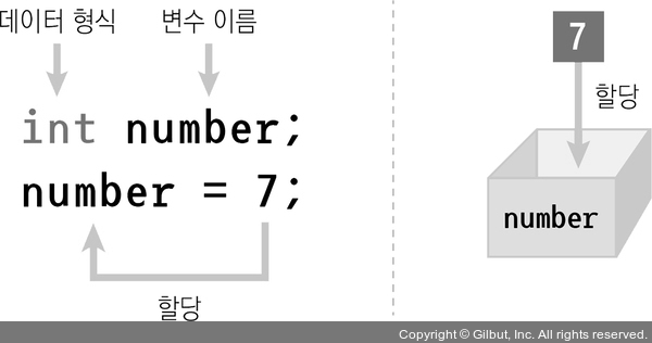 변수를 선언했으면 값을 넣어 주어야 합니다. 변수에 값을 저장하는 것을 값을 대입 또는 할당한다고 표현합니다. 변수는 다음 그림과 같이 선언한 후 값을 할당할 수 있습니다.