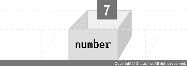 변수를 선언하고 값을 할당한 후의 메모리 상태를 표현하면 다음 그림과 같습니다. 정수형을 담을 수 있는 number 변수를 선언한 후 7을 할당한 상태입니다.