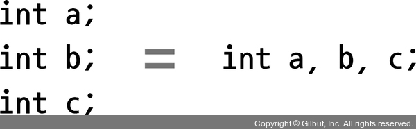 다음 그림과 같이 따로따로 변수를 선언하는 방법과 콤마로 구분해서 한 번에 선언하는 방법은 기능이 같습니다.