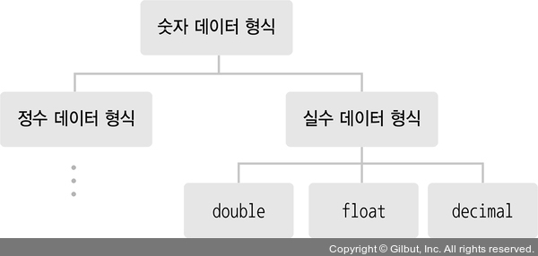 실수 데이터는 부동소수점 방식과 십진 방식을 다루는 세 가지 데이터 형식 키워드인 double, float, decimal을 제공합니다.