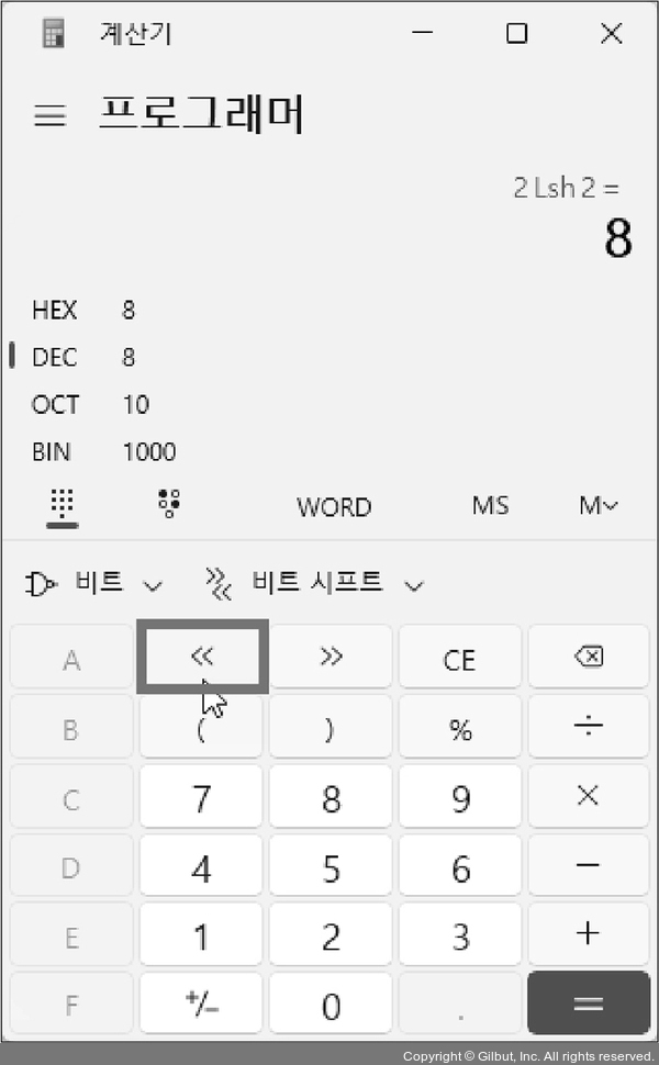 • 계산기로 2 << 2를 수행하면 그림과 같습니다.