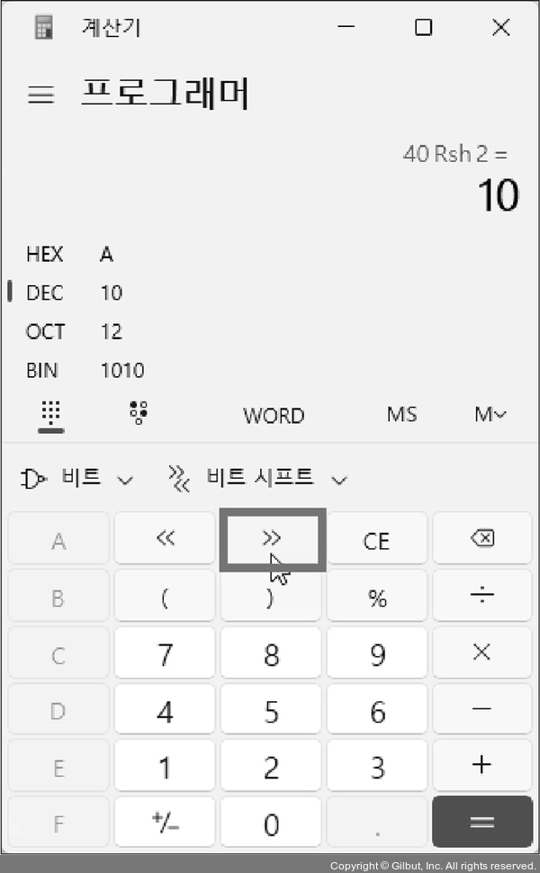 • 계산기로 40 >> 2를 수행하면 그림과 같습니다.