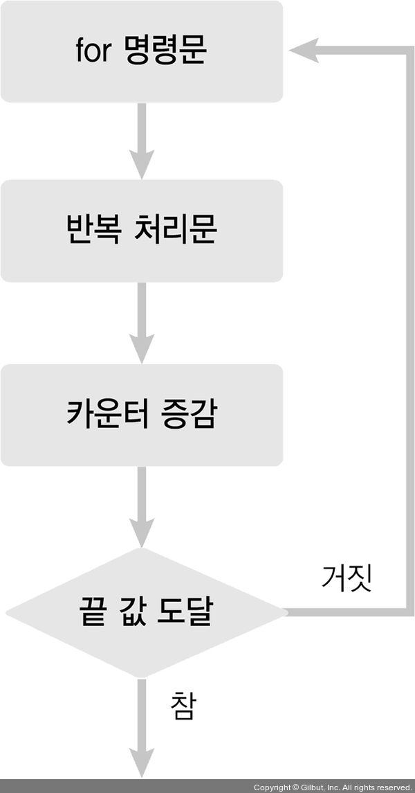 for 문은 초기식부터 조건식까지 증감식 크기만큼 증가 또는 감소시키면서 작업 명령문을 반복하여 실행합니다. 말이 조금 어렵죠? 실제 사용 가능한 코드를 여러 번 반복하다 보면 금방 이해할 수 있으니 걱정하지 않아도 됩니다. 중요한 것은 소스 코드를 반드시 입력한 후 결과를 보고, 그 내용을 이해하려고 노력해야 한다는 점입니다.