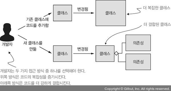 ▲ 그림 4-3 기존 클래스에 코드를 추가할까, 새 클래스를 만들까? 두 방법 모두 장단점이 있다.