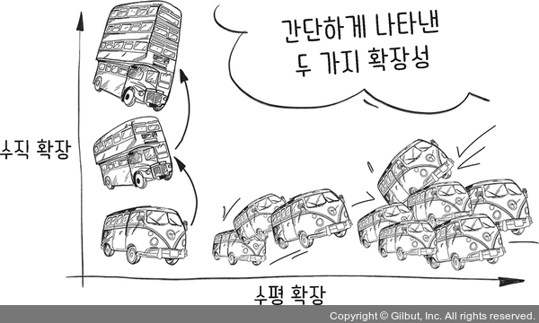 어떤 단위 작업의 처리 시간을 줄이려면 결국 수평 확장성(스케일아웃, scaling out)을 꾀해야 한다. 수평 확장성은 기존의 처리 자원과 새로 추가된 처리 자원에 부하를 분산하는 방식으로, 시스템이나 프로그램의 성능을 증가시키는 방법이다. 처리 자원의 수를 늘릴 수 있는 한 시스템 성능도 높일 수 있다. 수평 확장에서는 수직 확장에 비해 확장성 문제가 일어날 여지가 적다.