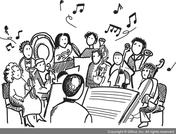 • 그 아래, 런타임 시스템 계층에서 멀티태스킹이 일어난다. 각 연주자들이 서로 다른 악기를 가지고 곡의 제각기 다른 부분을 함께 연주하는 것에 비교할 만하다. 곡의 흐름은 지휘자의 지휘를 따라 특정한 그룹에서 다른 그룹으로 이동한다. 컴퓨터 시스템으로 치면 여러 프로세스가 전체 프로그램의 목적에 따라 맡은 작업을 실행하는 것과 같다.