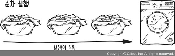 작업의 순차(serial) 실행은 첫 번째 작업에서 두 번째 작업, 그리고 그 뒤로 계속 이어지는 사슬과도 같은 것이다. 다만, 두 작업 사이에는 시간적으로 겹치지 않아야 한다. 오늘이 밀린 빨래를 처리하는 날이라고 상상해보라. 대부분의 가정이 그렇듯 세탁기는 한 대뿐이라 색깔 있는 셔츠와 가장 좋아하는 흰색 티셔츠를 같이 세탁한 뒤의 참상을 잊을 수가 없다.
