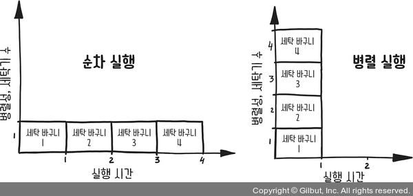 병렬 실행(parallel execution)이란 작업을 물리적으로 동시에 실행하는 것을 말한다. 병렬 실행은 순차 실행의 반대 개념이다. 병렬성(parallelism)은 병렬로 실행되는 작업의 수로 측정할 수 있는데, 여기서는 세탁기가 네 대 돌아가고 있으므로 병렬성은 4와 같다.