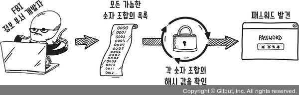 무차별 대입 공격(brute force)은 가능한 모든 조합의 목록을 만들고 이 목록의 요소를 일일이 대입해 해답을 찾는 일반적인 해법이라고 알려져 있다. 여기서는 가능한 모든 번호의 조합을 만들고 그 목록의 패스워드를 해시화했을 때 시스템에서 발견한 해시 값과 일치하는지 확인해야 한다.