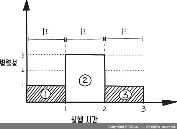 이 알고리즘의 단계 ①과 ③은 1초가 걸리고, 단계 ②는 3초가 걸린다. 결국 알고리즘 전체를 혼자 수행하면 모두 합해 5초가 걸린다. 단계 ①과 ③은 순차적인 작업이므로 이 작업은 독립적인 작업으로 나누어 병렬로 실행할 수 없다. 하지만 단계 ②는 사람 수가 충분하다면 카드를 원하는 만큼 나누어 어렵지 않게 병렬 실행이 가능하다. 만약 친구 두 명의 도움을 받는다면 단계 ②의 실행 시간을 1초로 줄일 수 있을 것이다. 이 경우, 전체 수행 시간은 3초가 된다. 속도가 약 40% 빨라졌다. 여기서 속도 증가는 병렬로 실행했을 때의 수행 시간을 단일 처리 자원을 사용해 순차로 실행했을 때의 시간으로 나눈 값으로 계산한다.